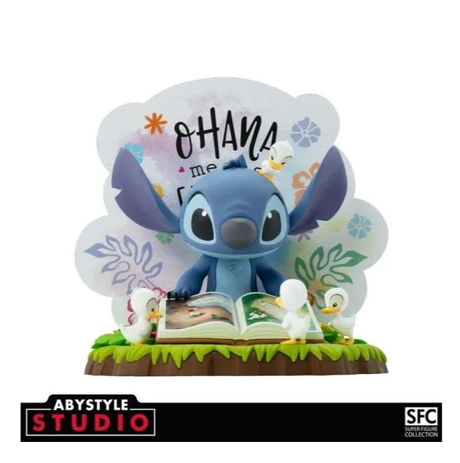 Diese Figur präsentiert Stitch in einem seiner emotionalsten Momente: umgeben von kleinen Entenküken und mit Lilos Buch in den Händen. Die Szene erinnert an die zentrale Botschaft des Films – Ohana bedeutet Familie.