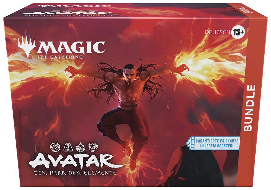 Avatar: Der Herr der Elemente Bundle enthält 9 Avatar: Der Herr der Elemente Play-Booster plus Zubehör mit 1 Promokarte als traditionelle Foilkarte mit alternativer Illustration, 30 Standardländern (15 Foil und 15 Nicht-Foil), 1 übergroßen Spindown-Lebenspunktezähler und 2 Regelreferenzkarten.