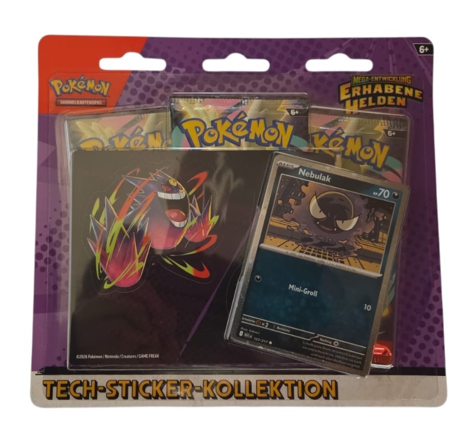 Die Tech‑Sticker‑Kollektion aus der Reihe Mega‑Entwicklung 02.5: Erhabene Helden bringt frischen Schwung in jede Pokémon‑Sammlung. Enthalten ist eine holografische Promokarte – wahlweise Glumanda oder Nebulak – sowie ein thematisch passender Tech‑Stickerbogen, der Mega‑Glurak Y oder Mega‑Gengar zeigt.
