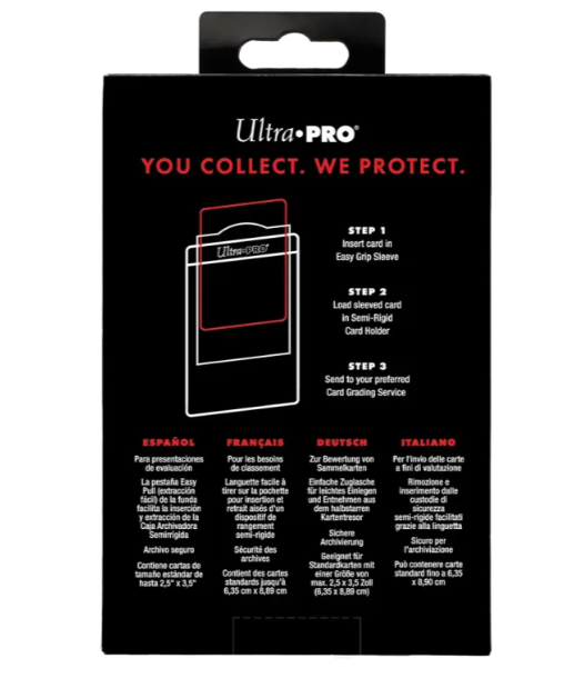 50 Semi-Rigids und 50 Easy Pull Sleeves um Ihre wertvollen Karten sicher zur Bewertung zu senden und dabei optimal zu schützen.